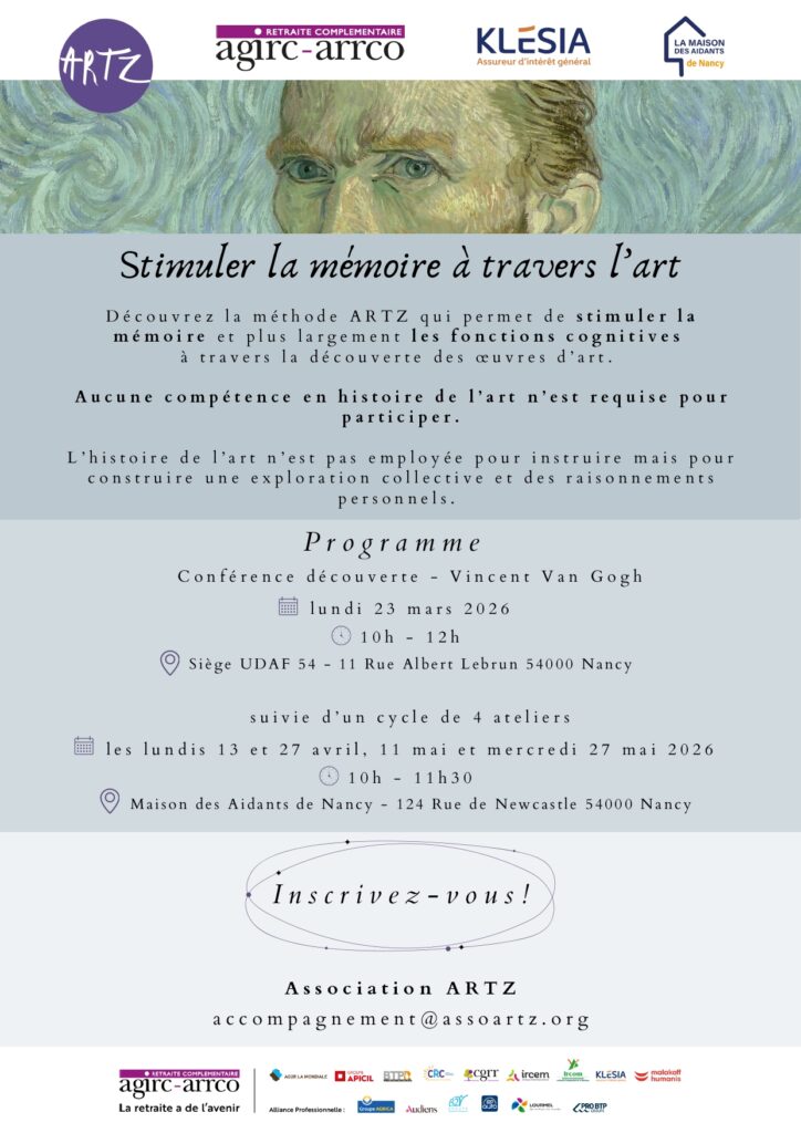 Suite à cette conférence, un cycle de quatre ateliers a été lancé. Il se déroule à la Maison des Aidants de Nancy. Ces séances permettent d’approfondir la méthode ARTZ. Elles offrent un cadre régulier pour stimuler la mémoire. Chaque atelier propose une exploration guidée d’œuvres d’art. Les participants échangent, observent et construisent ensemble du sens.
